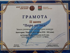 Грамота за второ място „Перо от лед“
